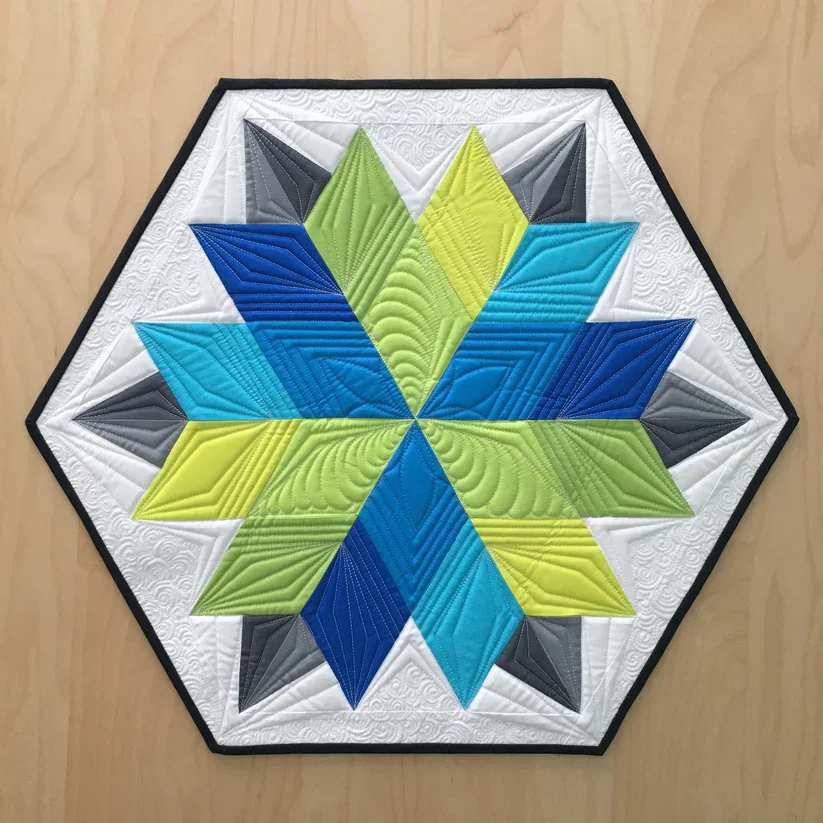 Jaybird Quilts Nova Table Topper is a super fun project. It’s made with the Sidekick ruler (or Super Sidekick ruler) also by Jaybird Quilts. All pieces are rotary cut from fabric strips. It is machine pieced with no Y seams.